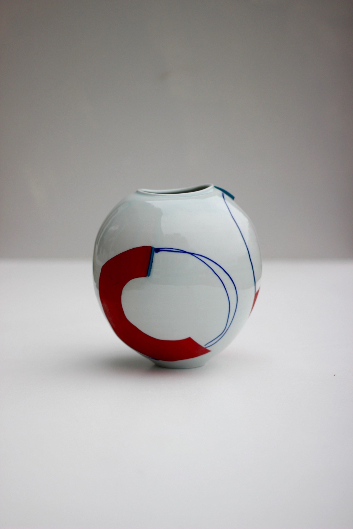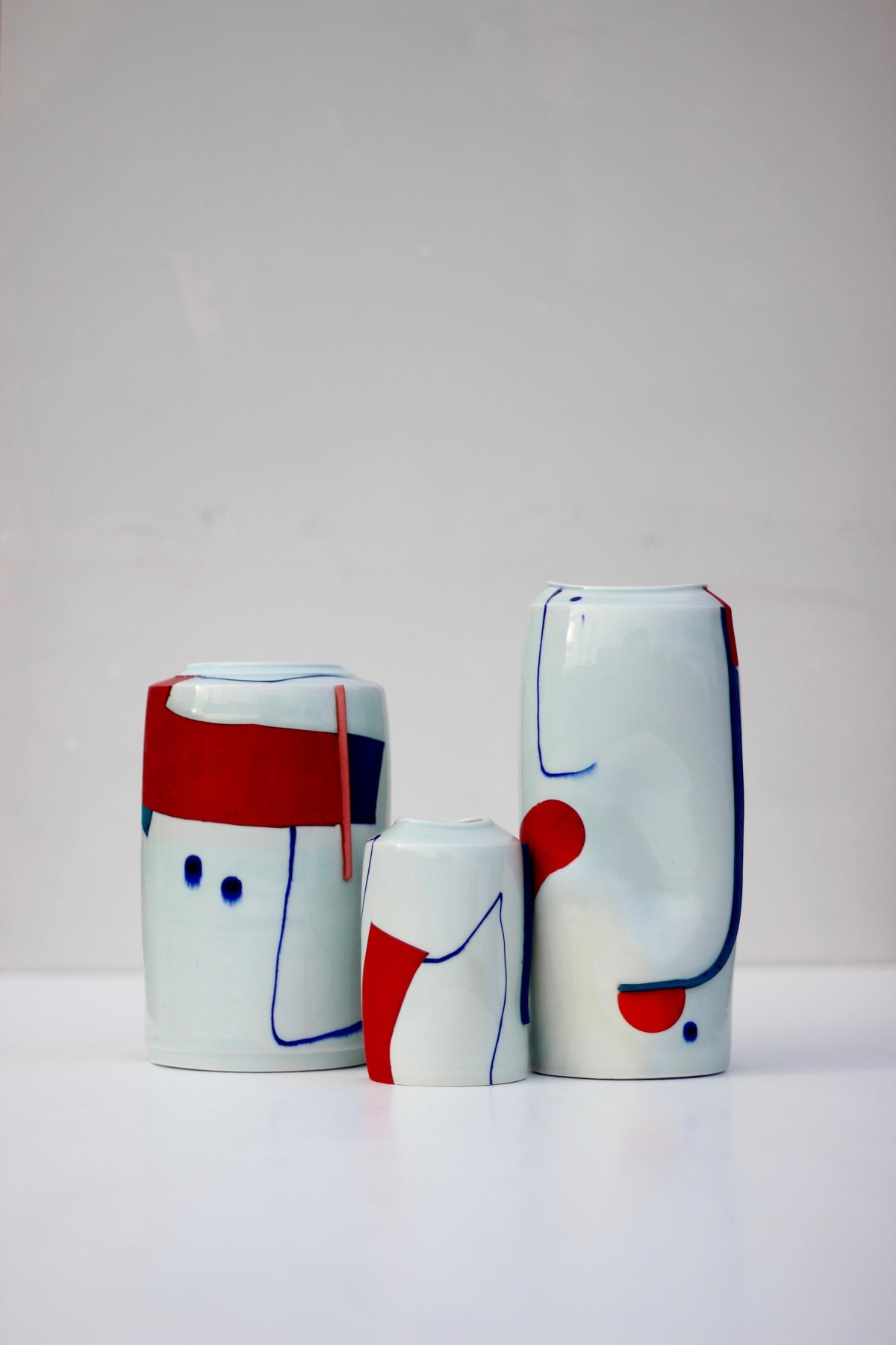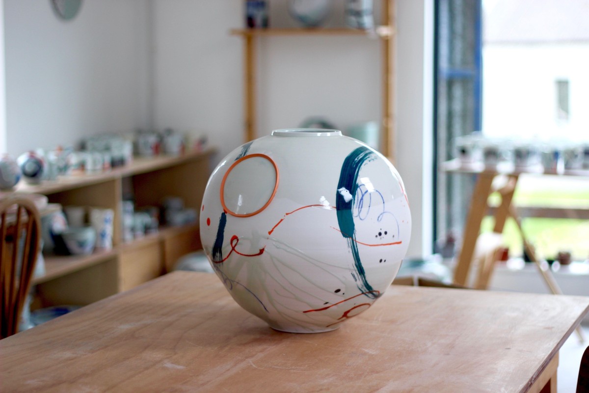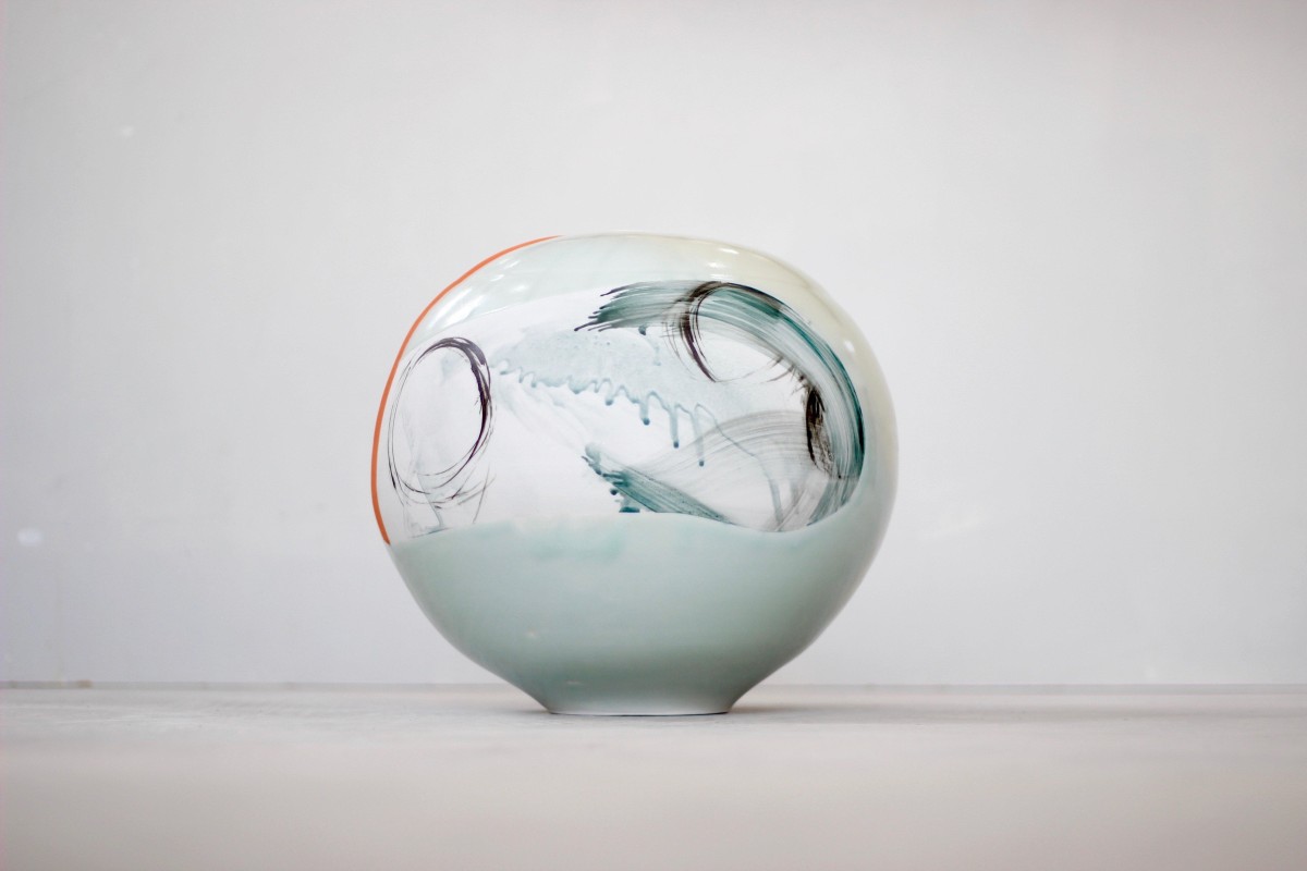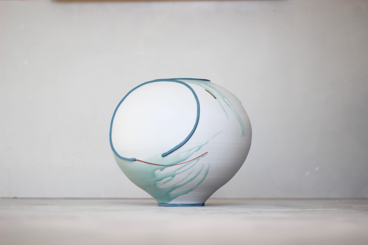 Working primarily in porcelain, Frew uses the surface of each pot as a canvas. The white ground provides a blank surface for mark making, where contrasts between sharp lines, crayon-like scribbles, brush marks and sponged-back sections interact with both glazed and bare areas. His marks are continually evolving, with each piece informing the next. He considers both glazed and unglazed areas in developing surface compositions. Texture is a recently added element in his work. He throws coloured clay ridges and applies these to the surface in circular and arching lines to break up the surface in a new way. These raised lines highlight the contours of the pot and create barriers that influence how glazes move and settle.