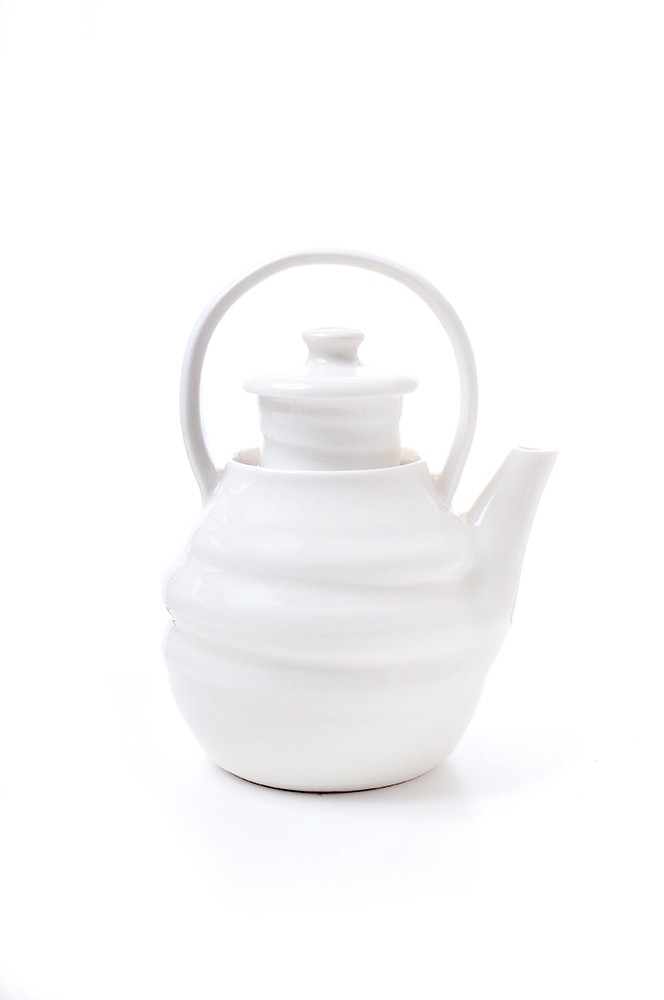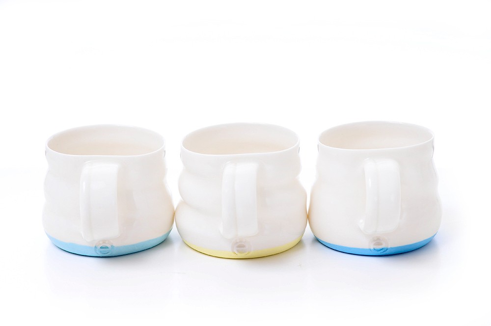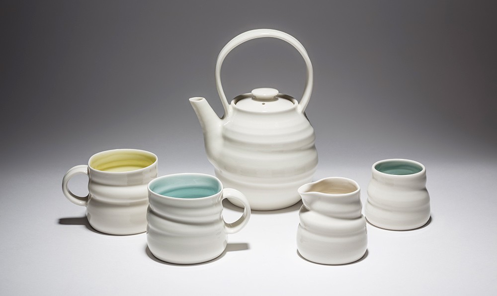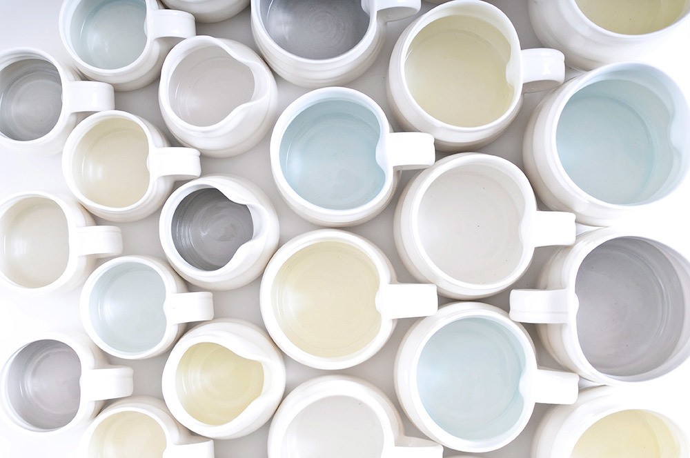 Every element of design has been considered to stimulate and heighten the user's experience of the piece. The work is wheel-thrown and then altered. She adds a spiral in the soft clay, then makes an indent where the handle will go. This activates the sense of touch and makes the mugs very comfortable to hold. She indents a line into the handles as a texture for the thumb to explore. The rims of the mugs are thrown thinly so they are crisp and pleasing for the lips. The base of each piece is individually polished leaving the translucent porcelain soft to the touch. The glossy glaze compliments the curves and echoes the use of liquid. She employs a soft, contemporary colour palette reflecting the subtleties of colour she sees within her environment, mixing glazes by hand to special recipes. Craftsmanship and attention to detail are central to her work.