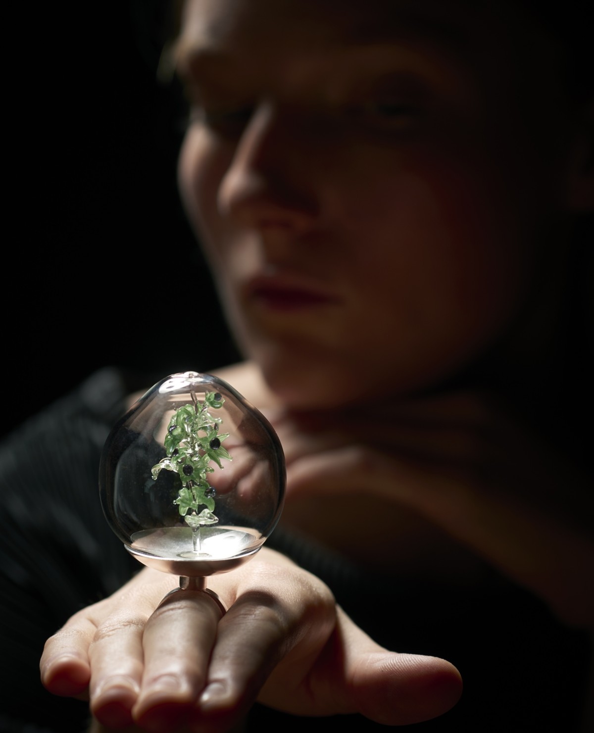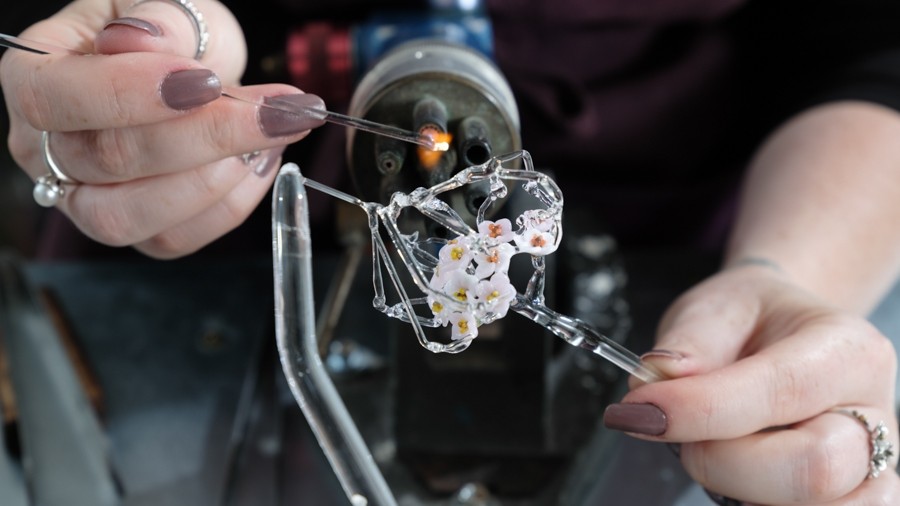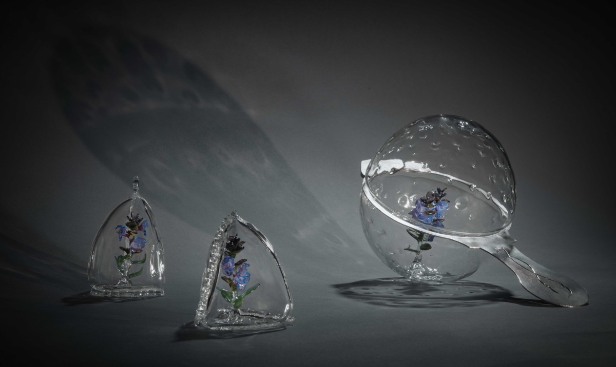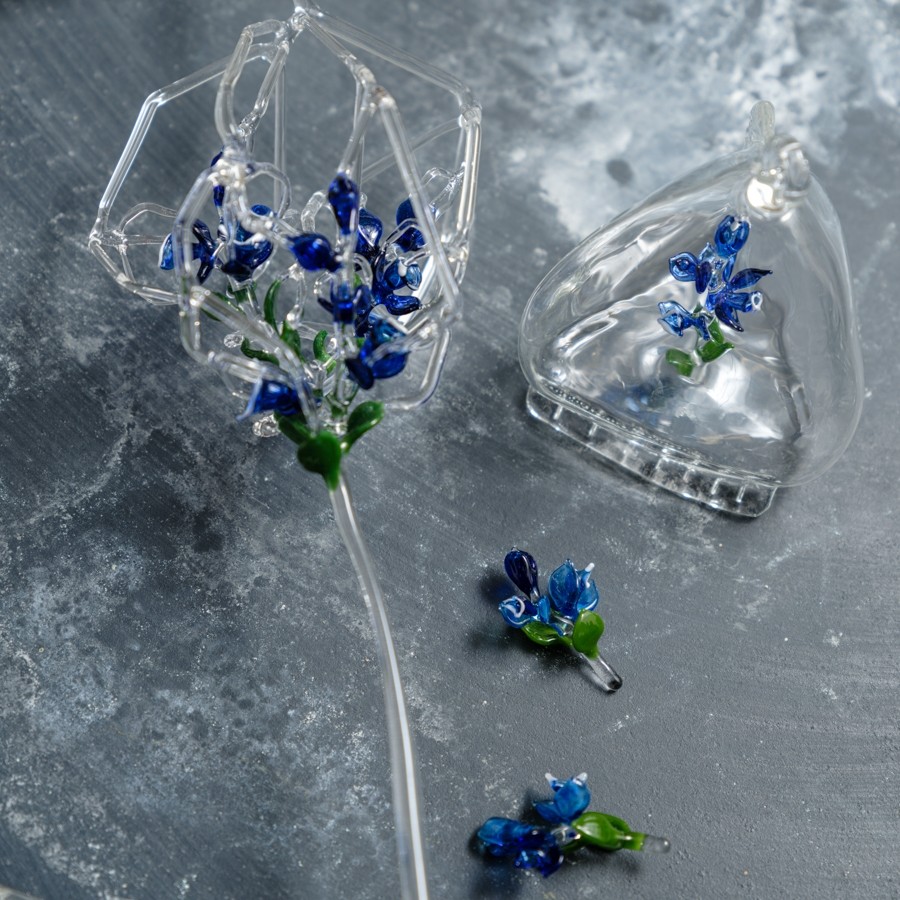 Her work draws on ethnobotanical research into the historic and contemporary uses of medicinal plants. Across a range of collections, Bourke creates intricate glass representations of botanical forms that reflect the transmission of ecological knowledge. Projects such as Ethnobotany, Biophilia, Symbiotic and Mithridate explore themes of healing, folklore and interdependence through sculptural glass objects and jewellery. Her ongoing project Apiculture continues this line of inquiry, focusing on bees, native flora and seasonal cycles. In this series, delicate glass flowers are arranged in honeycomb structures beneath cloches, referencing the relationships between pollinators, plant life and ecological balance. Together, her works form a growing archive that reflects Ireland’s long relationship with plants, people and place. Alongside her studio practice, she teaches within her community, sharing glassmaking skills and supporting the development of others in the field.