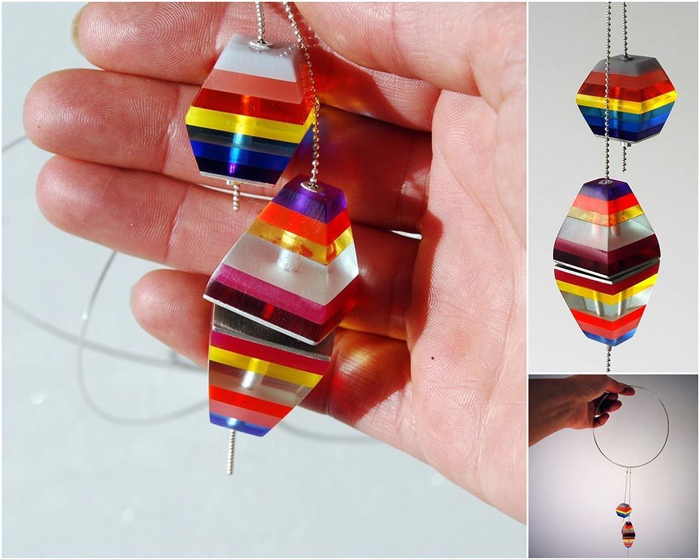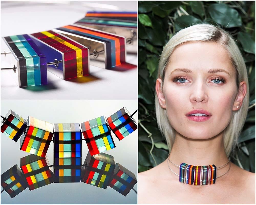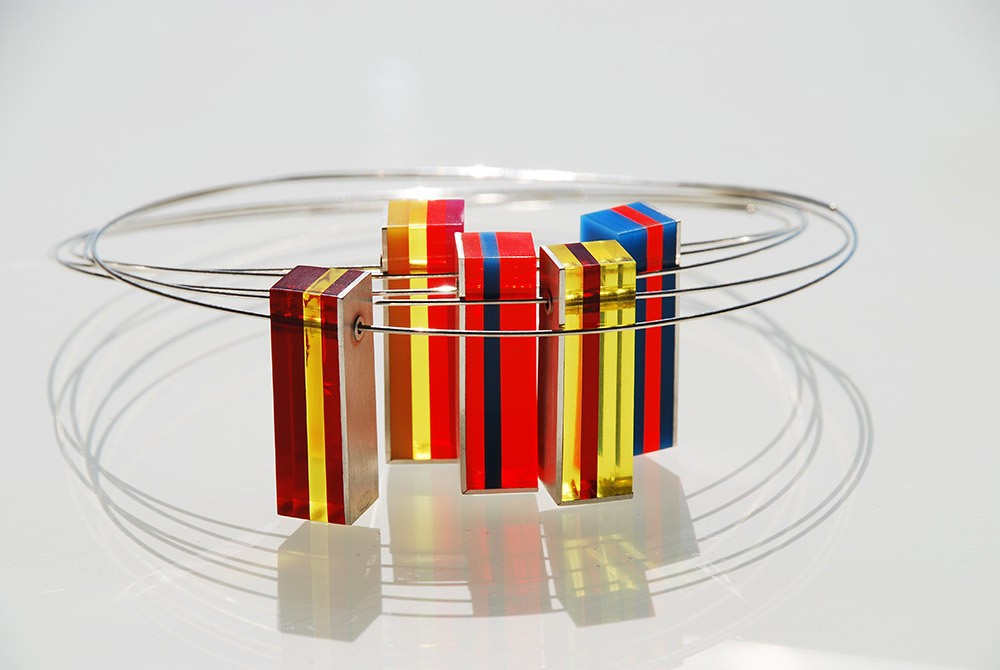In an extension of her sculptural practice, which has seen her complete several large-scale public commissions, she uses light and reflective surfaces to draw attention to the transient nature of existence, and the interdependence that exists between atmosphere, space, and the effects of materiality and form. She combines contemporary craftsmanship with cutting edge design to produce collections that are based on formal geometric principles. Consisting of individual modular units created by riveting together layers of coloured Plexiglas combined with precious metal, her work fully exploits the luminosity of the materials. At once sophisticated and playful, her jewellery refracts and filters light through carefully curated prisms.