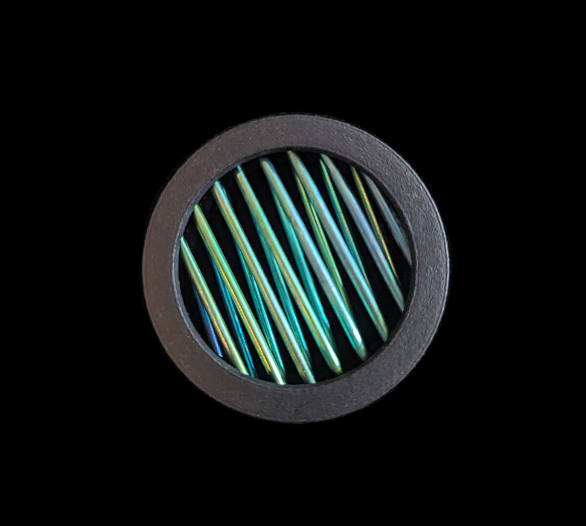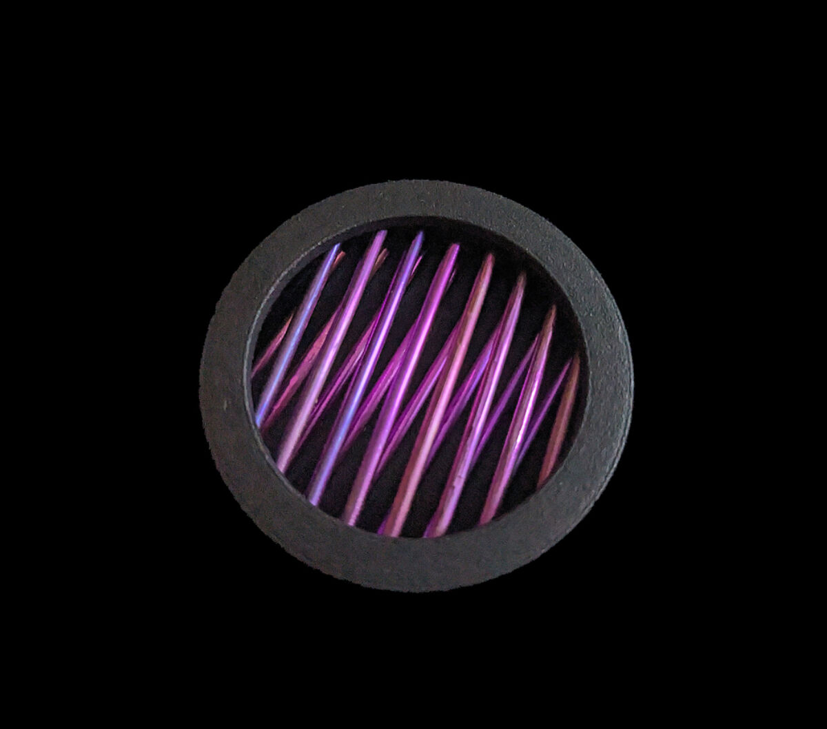 The possibilities of making the intangible tangible and visualising the unseen has always been the conceptual driving force within her practice, which is rooted in her background as a musician and singer. Music and sound exist as waves and vibrations through air, and in recent work she has explored how the human voice can be used as a tool to render visible the individuality of a person within a material and to further generate bespoke design. Using an augmented anodizing process – an electrochemical process whereby certain reactive metals, such as titanium and niobium, change colour when charged with electricity – she has developed a new technology that enables her to reveal certain colours on the metal’s surface based on the unique frequency of individual human voices. Combining technologies such as water-jet and laser cutting with handcrafted techniques, the voices' colours and shapes are synthesised and transcribed into final wearable forms.