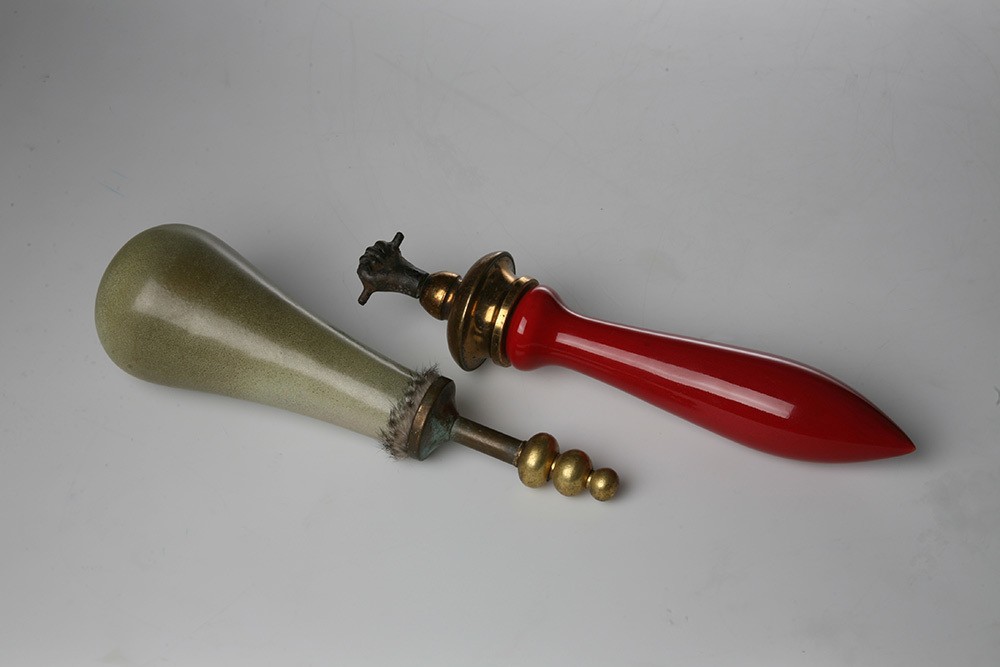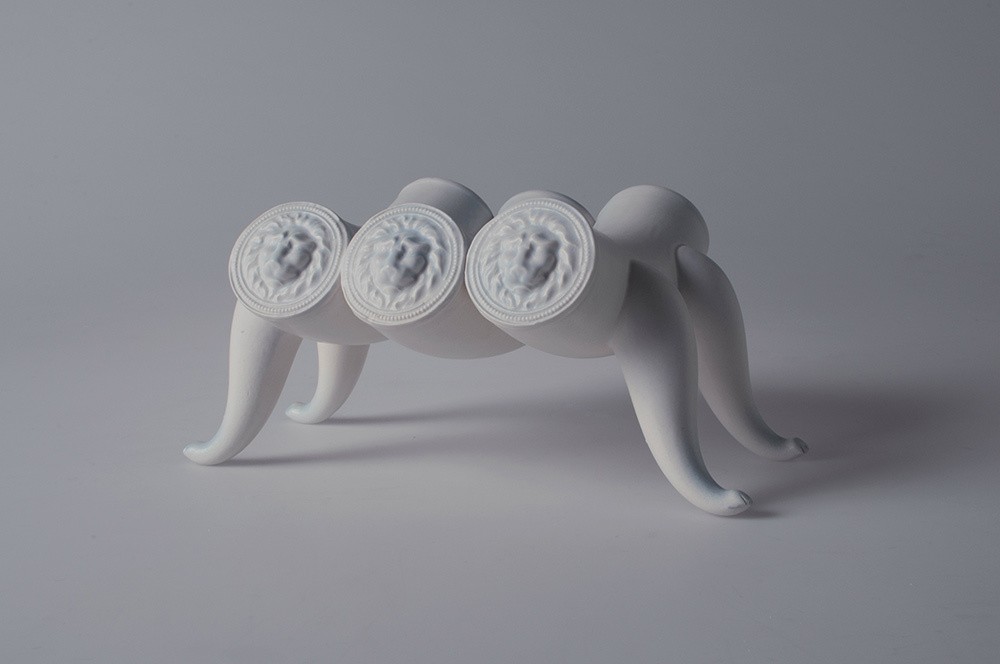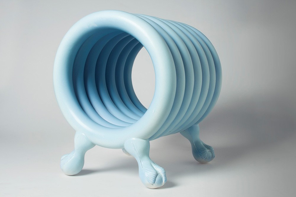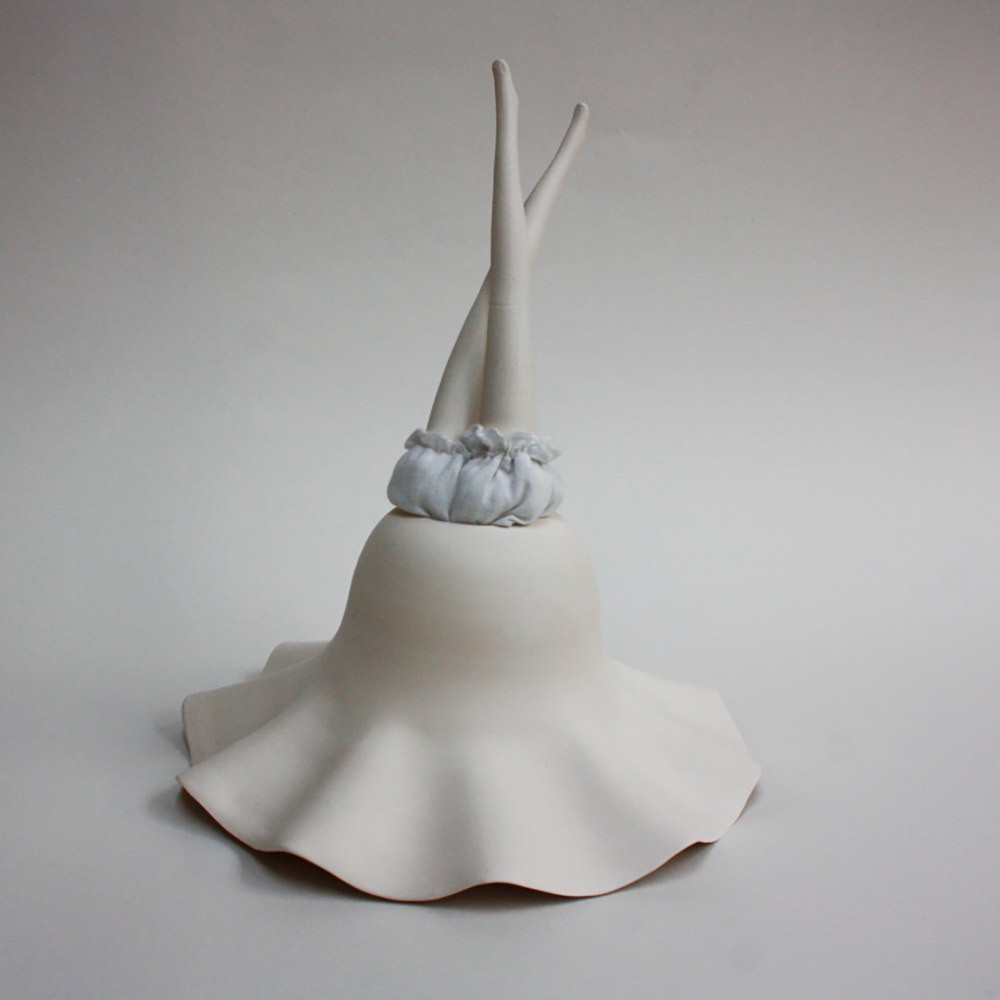 Inspired by the solitude of the rural Irish countryside in Annamoe and her grandmother’s eclectic Georgian house filled with beautifully crafted objects from around the world, her work manifests as surreal hybrid objects that reference the visual environments of her childhood. The work is playful and evocative, engaging the viewer with a sense of familiarity and wonder. It explores the relationships between people, objects and themes relating to memory, attachment and play through the use of familiar domestic forms, all drawing from personal narratives. She works with assemblage and found objects to produce composites. Casts are taken of various forms in plaster and then produced using earthenware slip, often in multiples that allow for a number of different combinations. Glaze is then added layer by layer, using different sized spray guns and stains to achieve small, detailed ‘blushes’ of colour on some areas.