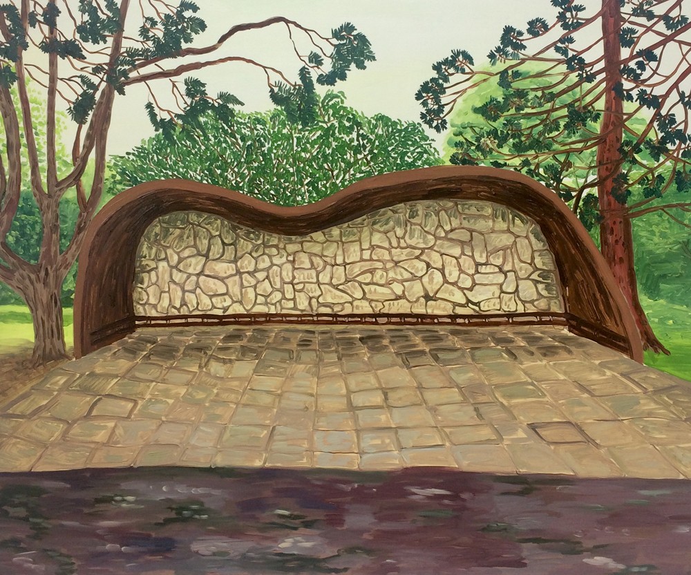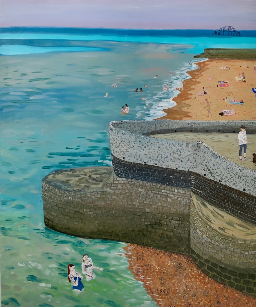 Walking and looking are important parts of her research, and she seeks out moments within her daily routine when the familiar becomes illuminated. While walking her dog (who often features in her paintings), making food or waiting for the bus she notes details that appear visually awkward or out of sync with their surroundings. This process is totally unplanned, and when something catches her eye she stops and photographs it, later making a painting based on the experience. Her painting style reflects the naïve gaze that becomes available in moments of extreme engagement with ordinary, everyday things. Off-beat and engaging, her work depicts scenes extracted from her day-to-day life with a childlike enthusiasm, re-focusing viewers’ attention on the poetic potential of the quotidian.