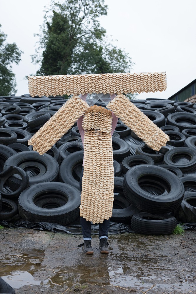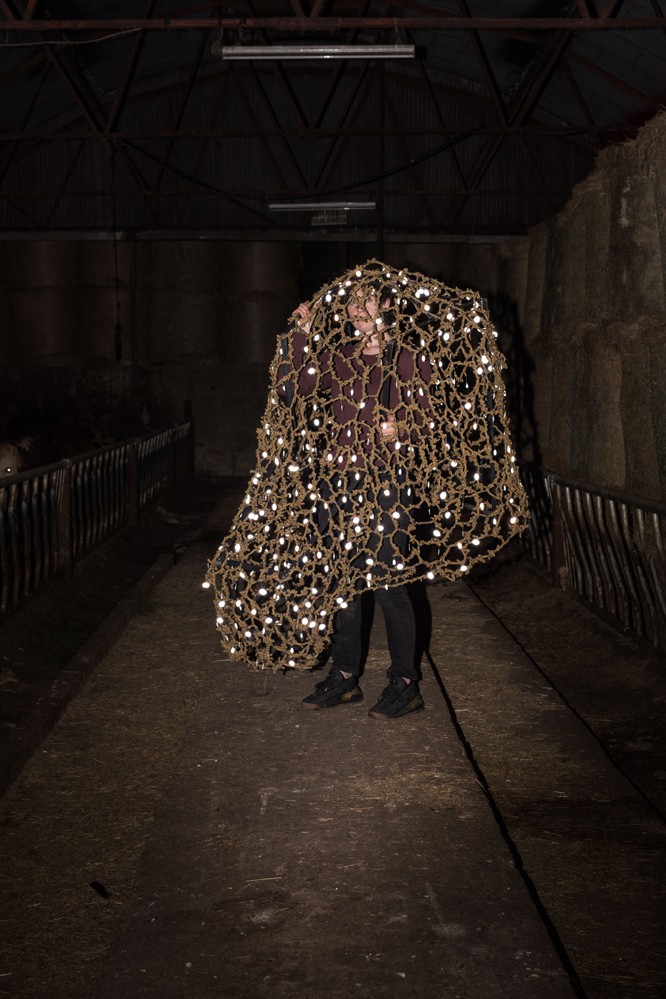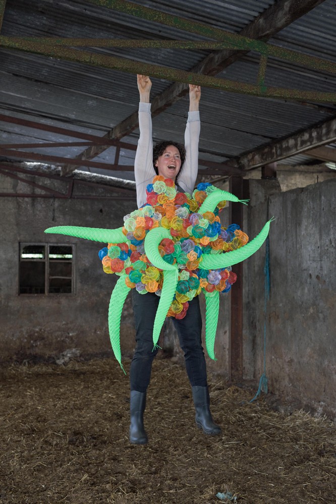 In recent years, she has made work about contemporary farming practices and agriculture, primarily focusing on cattle breeding. This has crossed over into research into the ongoing and deepening understanding of genetics, how this is being applied to livestock, and its wider societal implications. She has collaborated with numerous farmers and geneticists, creating work that is closely influenced by what they do. Her practice is primarily sculptural, with the objects she makes usually completed when worn on the body. She has tested this approach through performative interventions in live agricultural events, using photography and video as documentary tools. The materials she uses are chosen because of their typical function and then manipulated using traditional hand-crafting processes. These include AI (artificial insemination) straws repurposed to make sculptural objects using age-old straw-binding techniques, alongside more natural materials like Jute rope, wheat straw and even Jacob’s cream crackers.