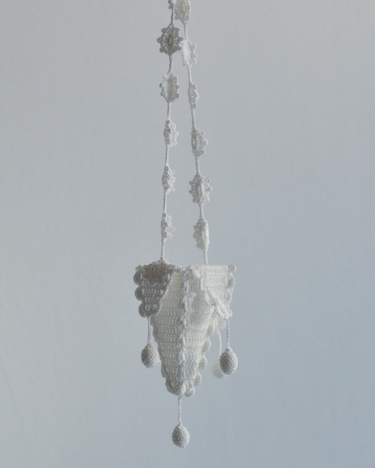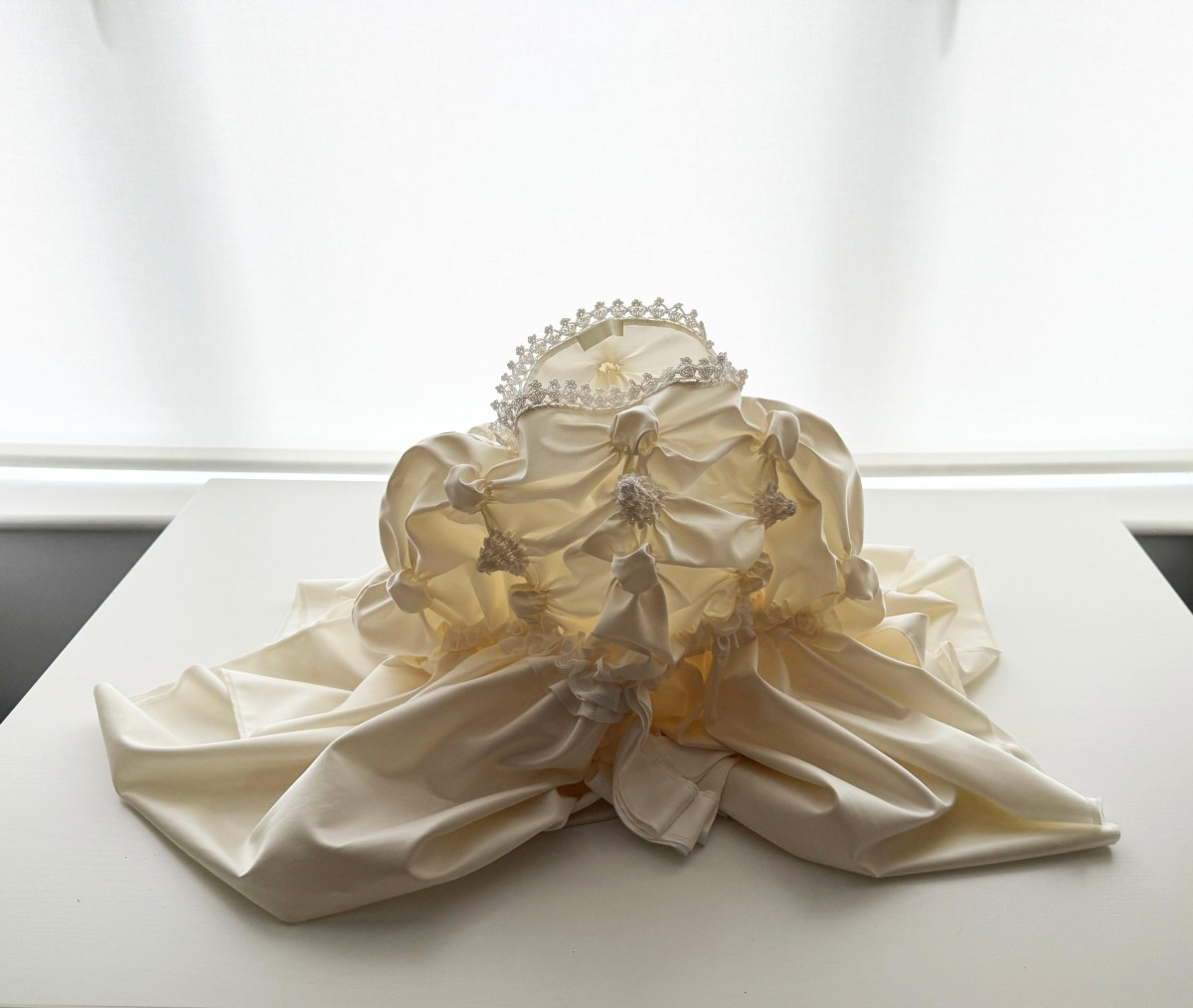 Her practice centres on sophisticated fabric manipulation through labour-intensive hand processes such as Irish crochet lace, hand smocking and whitework traditions. Working in a distinctive white-on-white aesthetic, she creates sculptural textile constructions where intricate detail emerges through light, shadow and texture rather than colour. Each piece exists at the intersection of haute couture fashion and the crafted artefact, reflecting a deep respect for materials and the processes used in their making. Pierce’s work engages with Ireland’s craft heritage, examining how historically undervalued women’s textile practices can be reimagined through contemporary making. Through workshops teaching Irish crochet lace alongside her mother, she contributes to the preservation and transmission of intergenerational craft knowledge.